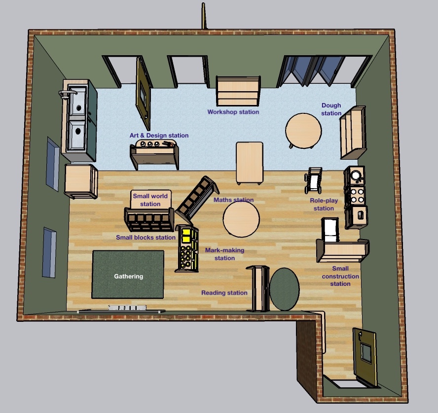The floor plan above shows how the creation of a number of learning stations will help to facilitate pupils' learning across different areas of the Early Years Foundation Stage curriculum. In addition to this indoor provision, a comprehensive outdoor environment, equipped with opportunities for large scale construction, further role play, sand play, water play and nature kitchen will add variety and new opportunities to support pupils' learning.